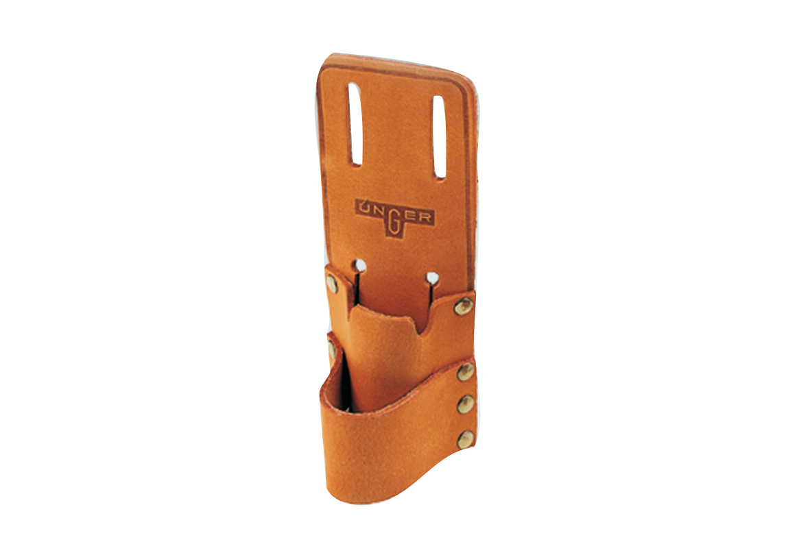 Porte-outils en cuir avec deux poches qui se fixe à la ceinture.